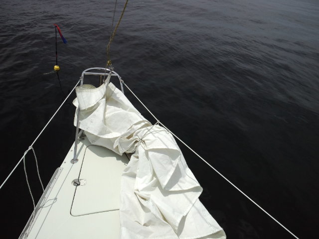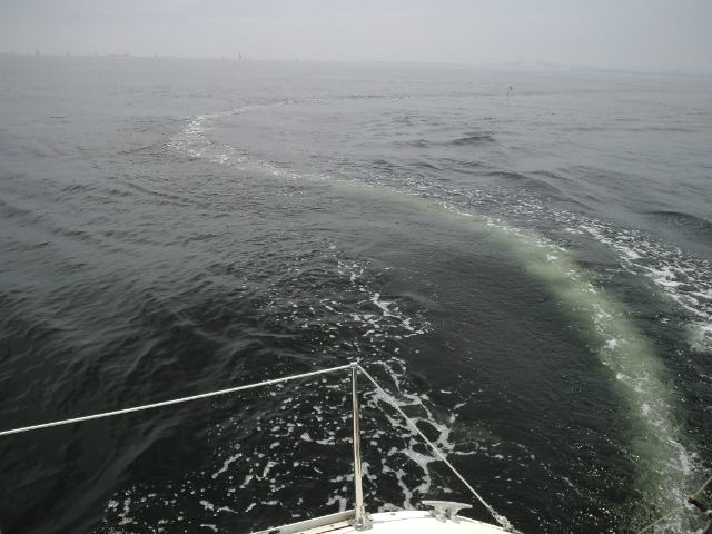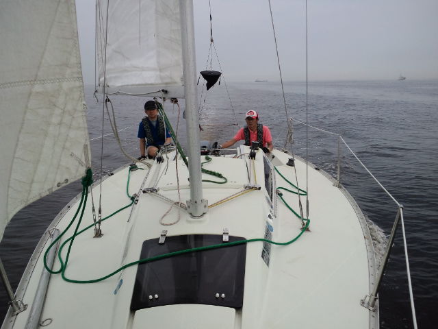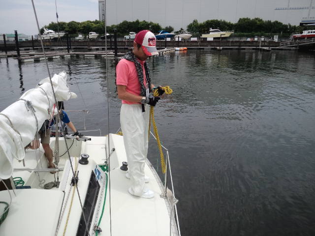 第1日目 雨、 SE-1~3m/s。朝からの雨の為、他に出港している艇は殆ど居ません。雨でもヨットスクールの艇は、出港します。SBDコースの目標である、ドッキングを練習します。微風の中でも風によって艇が流される状況を確認して頂き、実習を行いました。