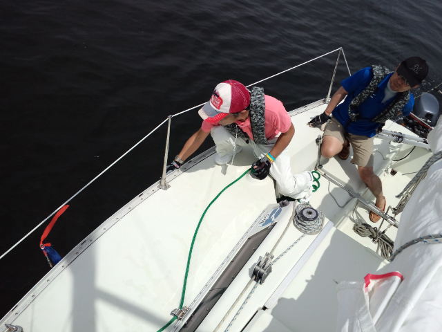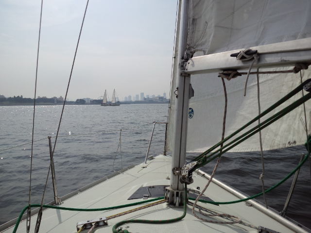 第2日目 晴れ、N-2~SE2m/s。今日は、機走での8の字救助の実習です。お昼からは、セーリング実習です。微風ですが、セーリングに必要な技術を学んでいただきました。