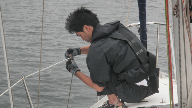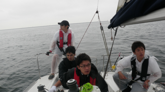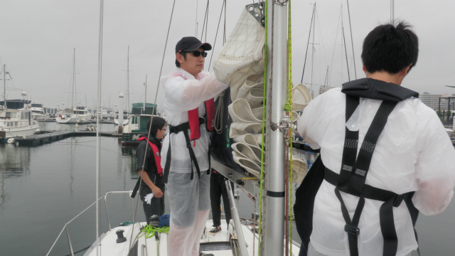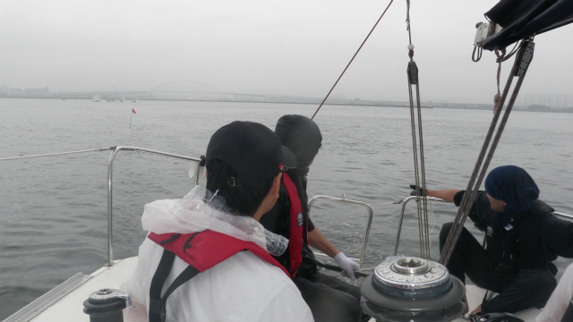 1日目は、どしゃ降りの雨。皆さん合羽をお持ちでなかったので、小雨になるのを待って出港。セーリング実習を行いました。徐々に雨がきつくなってきたので帰港。2日目は合羽をご持参頂き、1日目の分もセーリング実習を行いました。