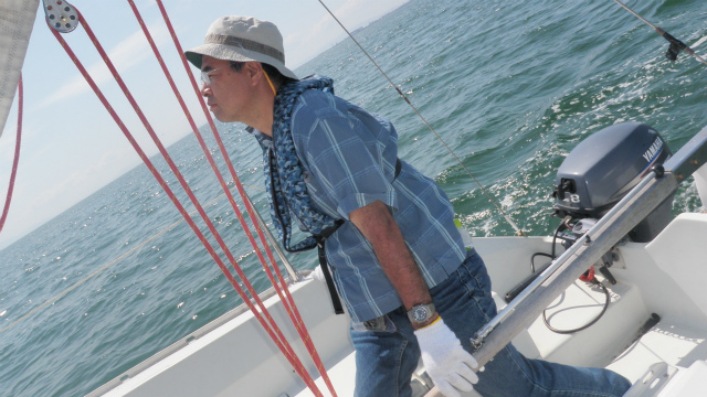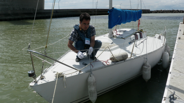 1日目の午前中は、座学が中心です。実際にライフジャケットを膨らましてみたり、インストラクターと一緒にロープワークやヨットの名称を学びます。お昼からは実習です。実際にヨットに乗って操船して頂きました。離岸着岸では、どのような風の影響を受けるかを学んで頂きました。