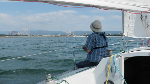 2日目は朝から出港です。昨日学んでいただいた事を復習していただき、沖に出ます。ヨットスクールでセーリングを学ぶのは当たり前ですが、安全にヨットを楽しんでいただく為に、落水者救助は欠かせません。