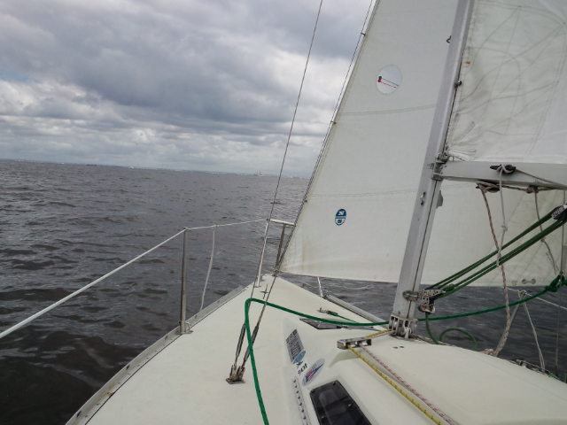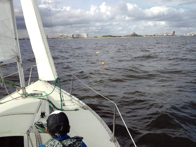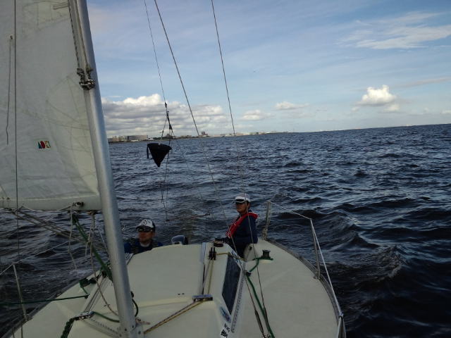 早速艇に向かい 艤装、出港しました。昨日より弱い風の中でセーリング実習と8の字救助法の実習を行いました。2日間を通し風の強さとその時々のセール選択の状況で艇の挙動が違うことを学んでいただけました。