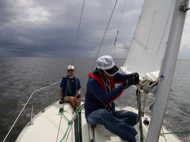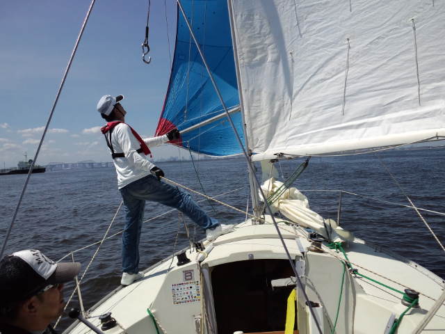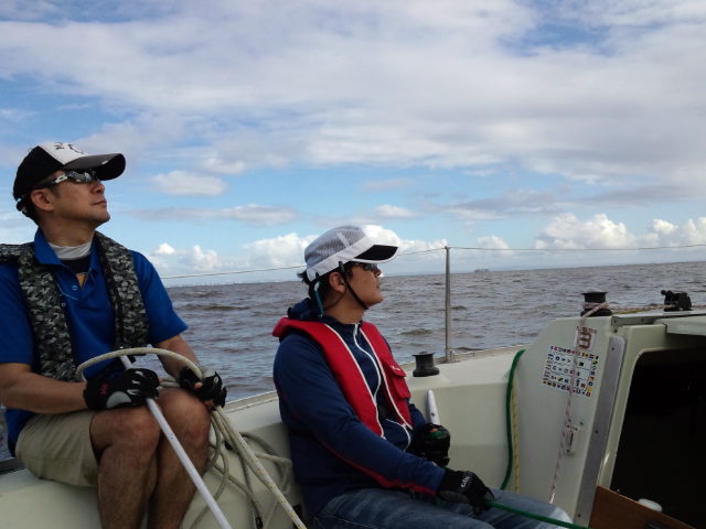座学の後、艇に向い艤装、出港しました。昼前やや風が上がってきたので、練習のためジブチェンジとメインのリーフを実施。午後からリーフの解除をして各風位のセーリングと8の字救助法の実習を行いました。