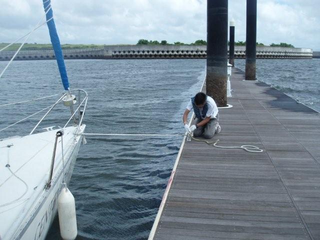 個人装備についての説明等の座学、出港準備を行いました。先ずはマリーナ内で機走での動きを体験します。 円を描くように舵をきっても、風に押し流されてしまいます。艇の動きになれたところで、帆走実習を行いました。