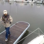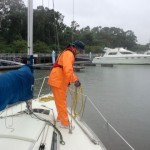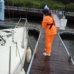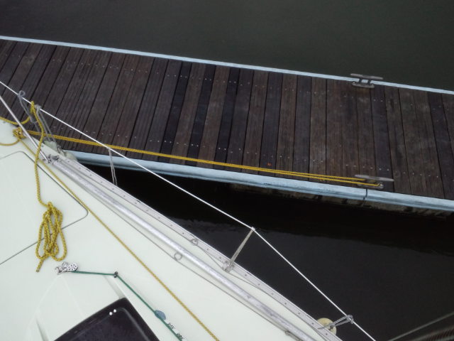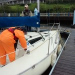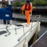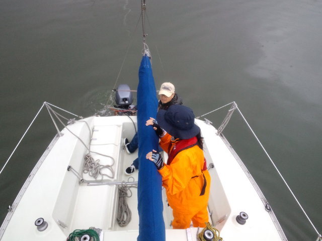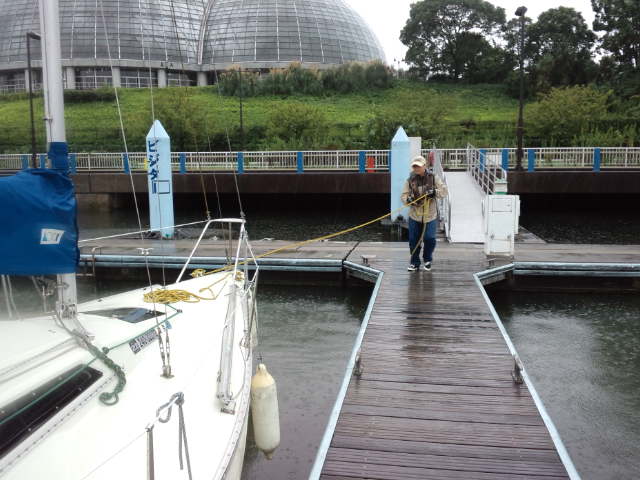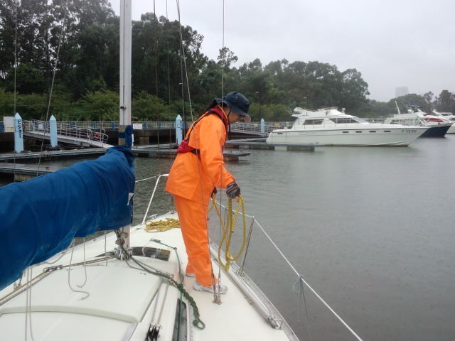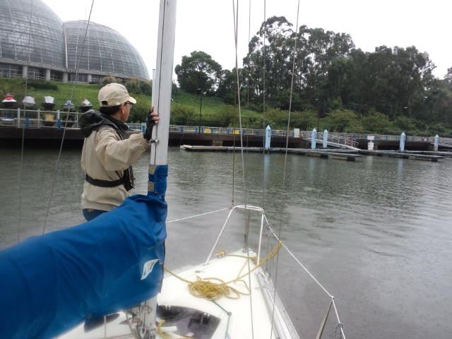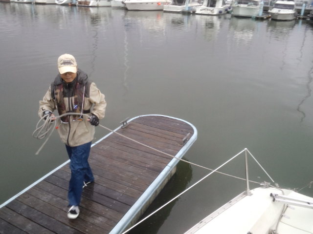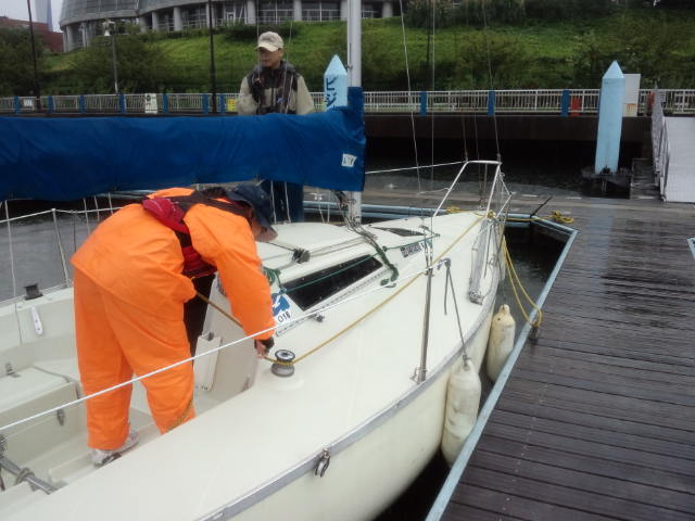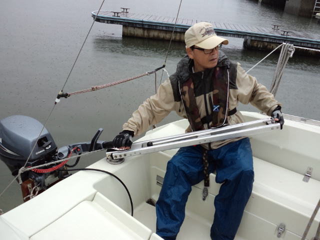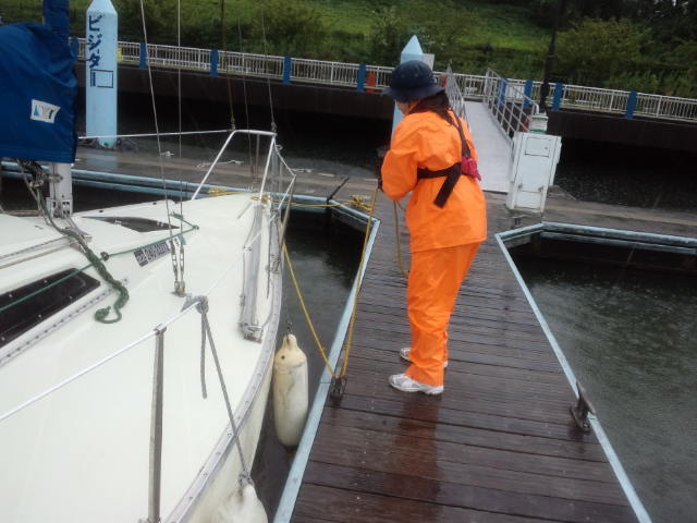 午前中は座学と予習問題の解説。午後から雨の中、艇に移動して実習を行いました。北よりの風が徐々に強まり、風の影響を確認するのによいコンディションです。 離着岸練習をする為移動する途中のブイを目標にし、ブイのちょうど横で停船するよう行き足調節の練習も行いました。時折雨が強く降り、風も徐々に強くなっていきますが、離岸と着岸の実習を行いました。