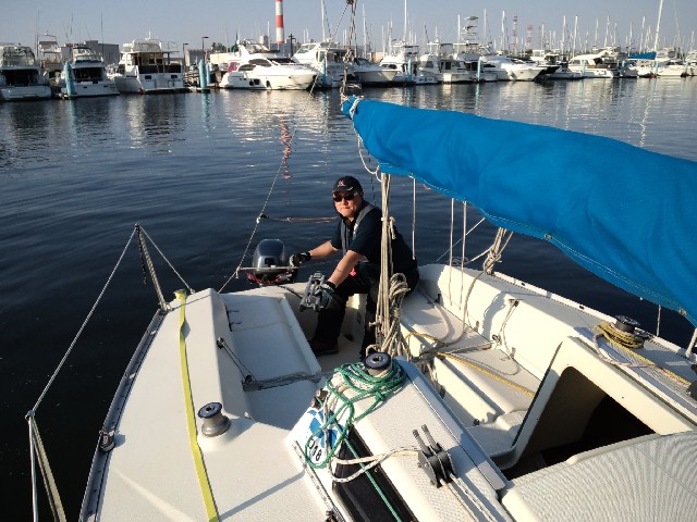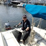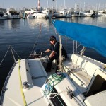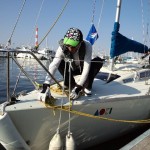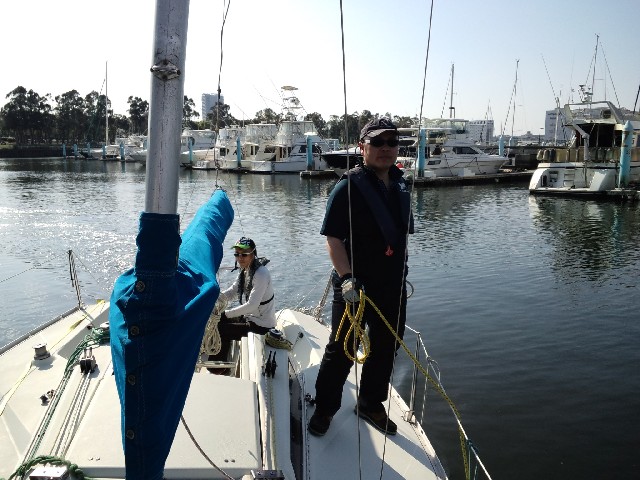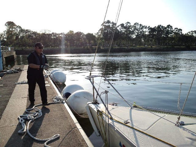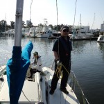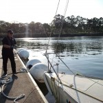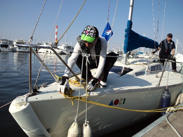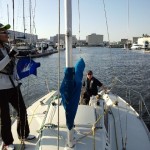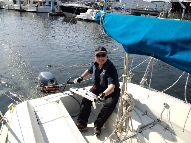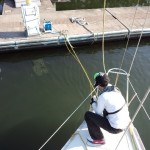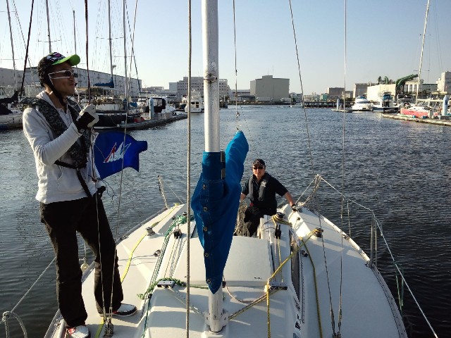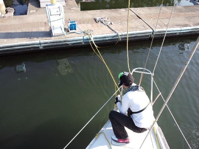 午後から艇に移動して実技を行いました。出港準備と安全装備の確認としてジャックラインと落水者引き上げ用テークルを実際に使用してみました。その後交代で基本の離着岸の練習。その場回頭の練習の後風上前進離岸法を練習を行いました。
