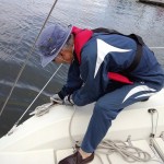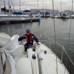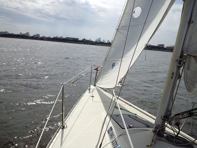 午前中は予習問題の解説を行いました。低体温症とセーリングでの8の字救助法の説明をしてから艇に移動して出港準備。午後からは風が強まる見込みですがジェノアをセットして出港。午後からセーリング練習です。
