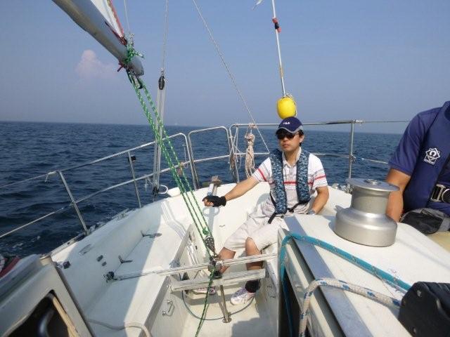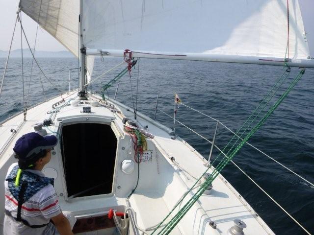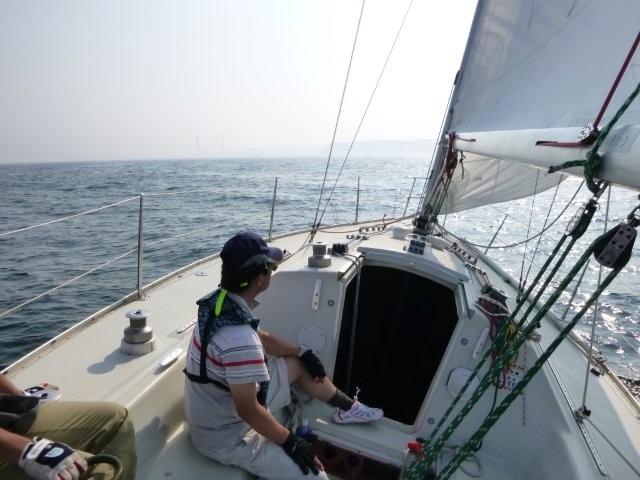 天気は晴れ。風はSW-5m/s。 東京は猛暑日。座学を行い、出港準備を行い出港。幸い沖には風があったので、セーリング実習、落水者救助実習を行いました。