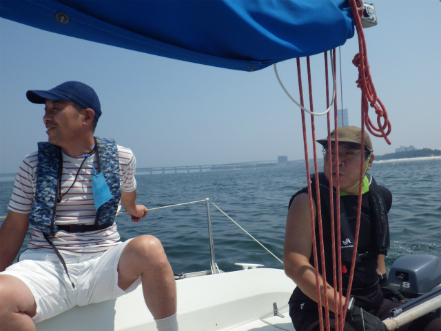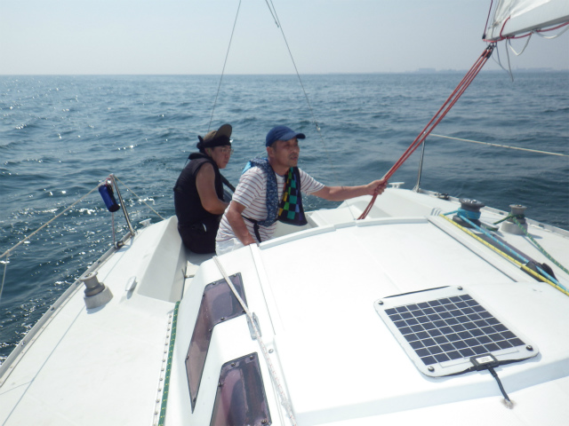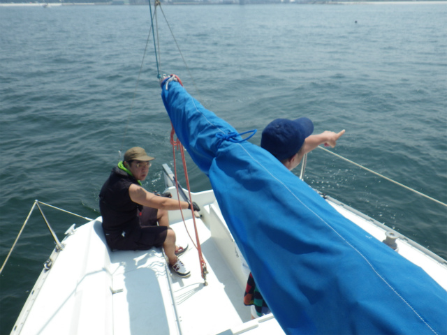 座学の後、熱中症対策をとり出港。離着岸を行い、セーリング実習を行いました。