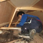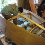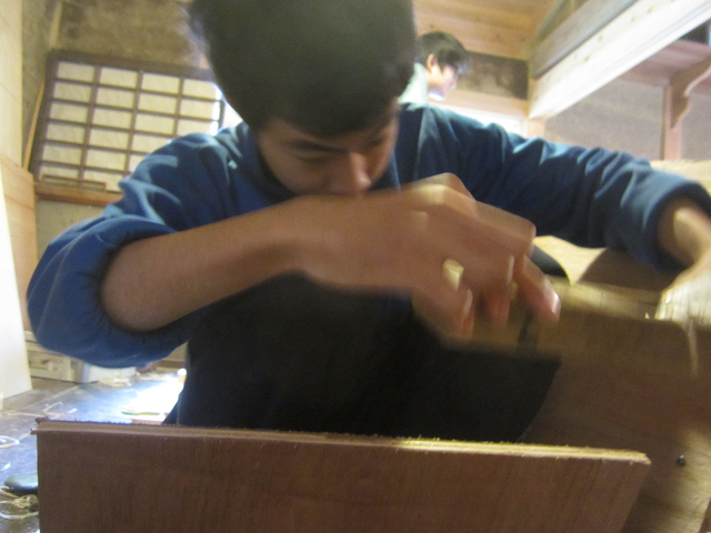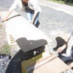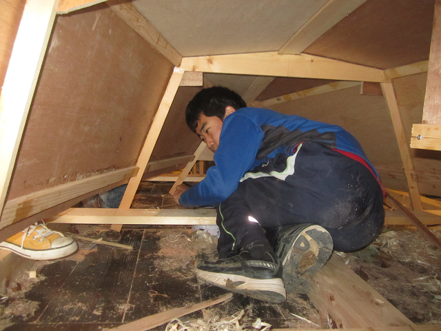 すでにベニア板の側板は張り終えているので、今日は底板を接着剤と、タッピングでフレームに貼付ける。接着剤の混合も、ドリルの使い方もなかなかうまい。
