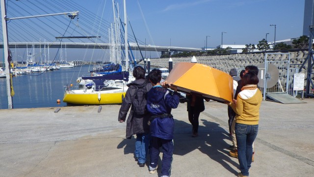 きのくに子どもの村学園の生徒たちが制作していた、ディンギーが完成した。カートップされたディンギーを下ろす生徒たちは、皆ニコニコしている。