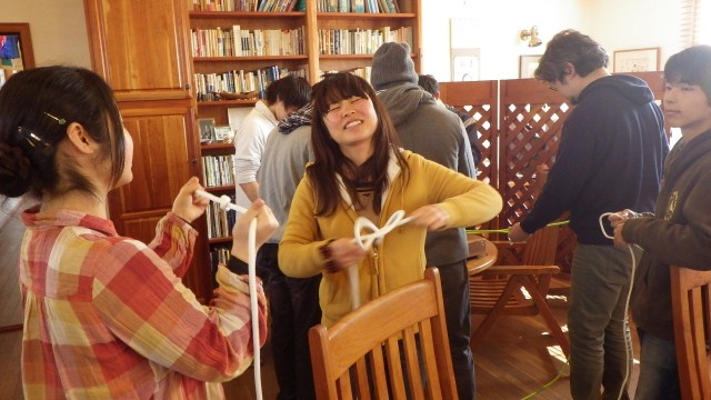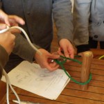 ヨットを組立てる前に、組み立てにも必要なロープワークを勉強する。皆すぐに覚えてくれる。