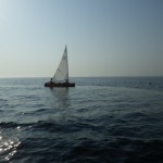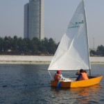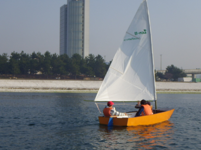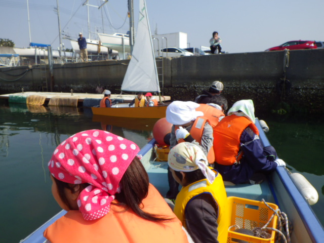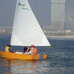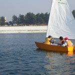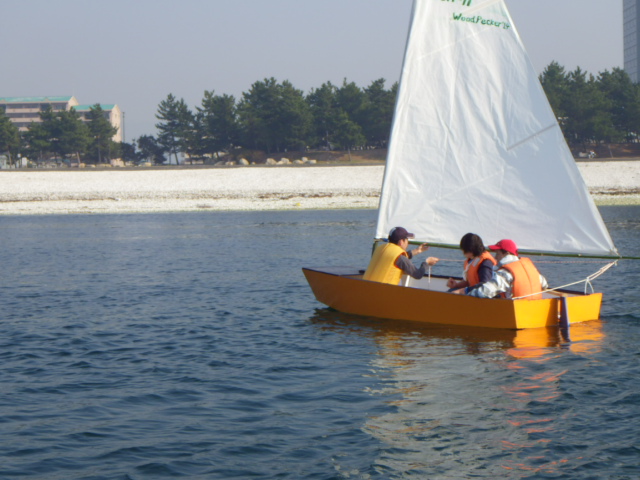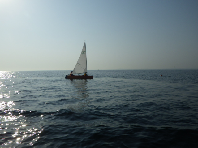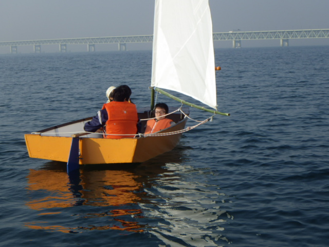 ヨットにマストやセールを取付け、組立てるのは、もう自分たちでできる。忘れていたロープの結び方も、思い出したようだ。 ライフジャケットを着用して、すぐに出港だ。港外までは小型エンジンボートで、曳航する。今日はあいにく風が弱い。マーブルビーチへ上陸して、水辺で休憩する。風邪も少し出てきたので、伴走するボートから交代でヨットに乗り移って、セーリングを実習する。風は微風だが、気持ちよく快走する。みな嬉しそうだ。