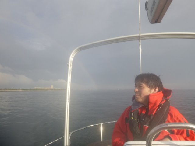 雨の中、自艇(33feet)でプラクティス教習をしました。 シングルハンドのための離着岸の練習です。 風が弱かったので、帆走は細やかな操船が必要でした。 帰港するころにようやく晴れて、虹がかかりました。