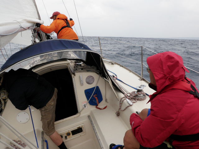 天気予報によると、台風17号が沖縄東方を通り、本州南側へ向かうようだ。南西諸島の海上予報は、北東の風30ノット、後40ノットとなっている。嵐のクロスホールドは、とてもつらい。航海距離は直線コースに比べると、約1.5倍を走らねばならなくなる。ピッチングが激しくなるので、お湯を沸かすことも困難となる。チャートワークも船酔いとの戦いだろう。体力の消耗が激しい。ミスも多くなるに違いない・・・。