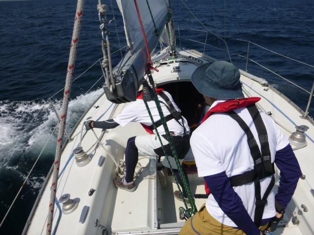 - デッキワーク、セールトリム、ヘルムスなどのヨット上のポジションを、クルーとして交互に担当します。ポジションを順番に練習して、全体の動きが理解できるよう、トレーニングを行います。