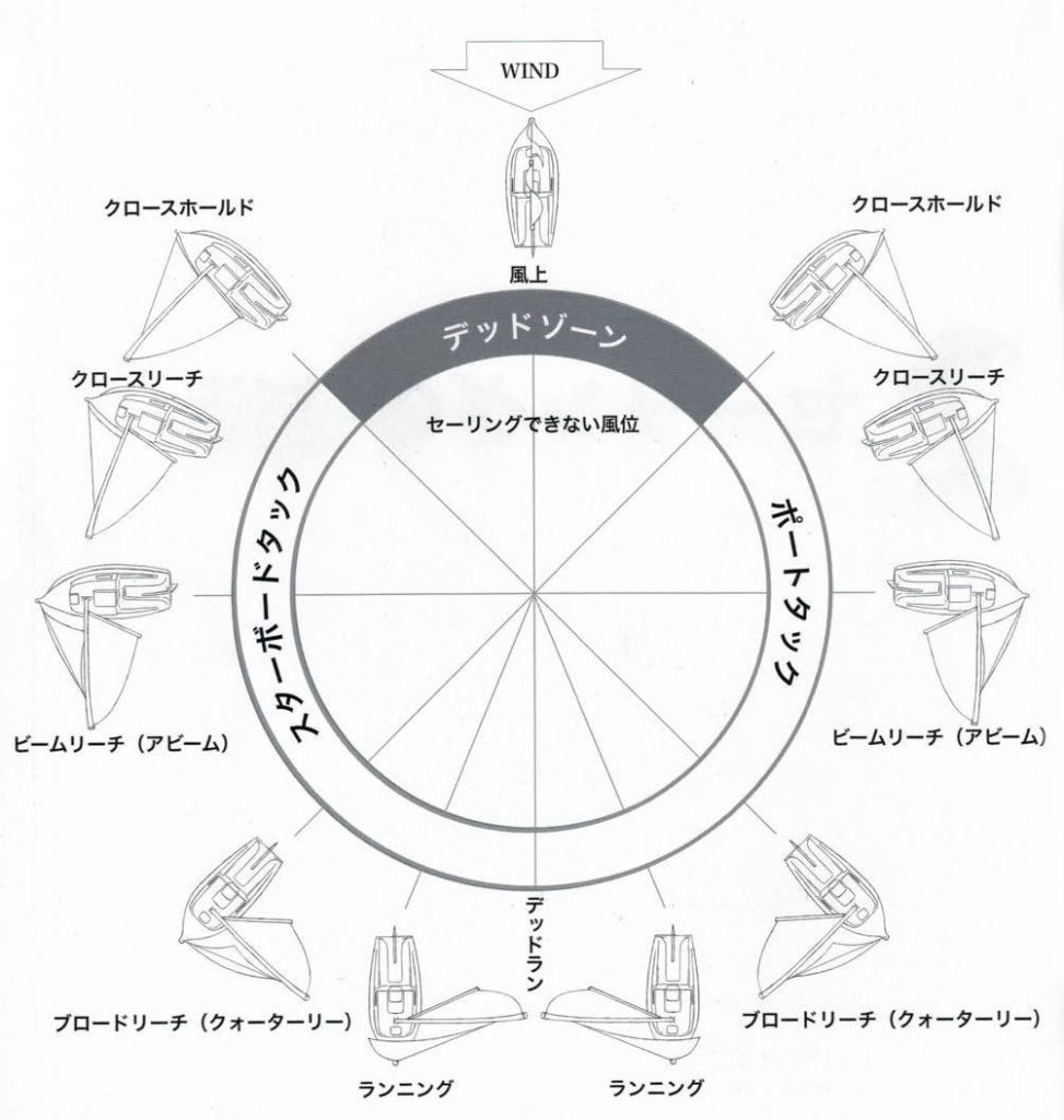 風位。ヨットがセーリングしているとき、自分に対して風を受ける角度の事。風上に対して、45度前方から風を受けるクロースホールド、クロースリーチ、ビームリーチ(アビーム)、ブロードリーチ(クォーターリー)、ランニング(追手)の5種類の風位で呼ぶ。