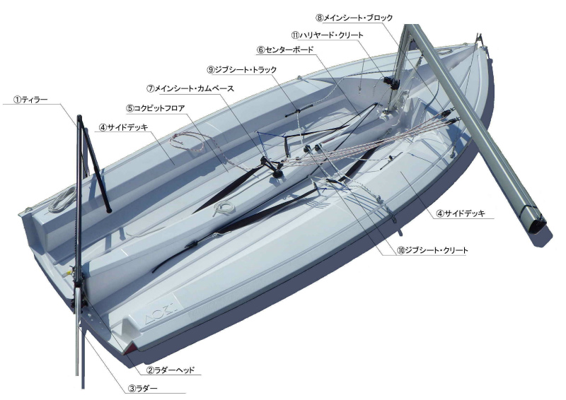 | ⑪ハリヤード・クリート | Ronstanカーボブロック、カーボカム付き、セーリング中でもワンタッチで、ハリヤードを固定できる。 |
