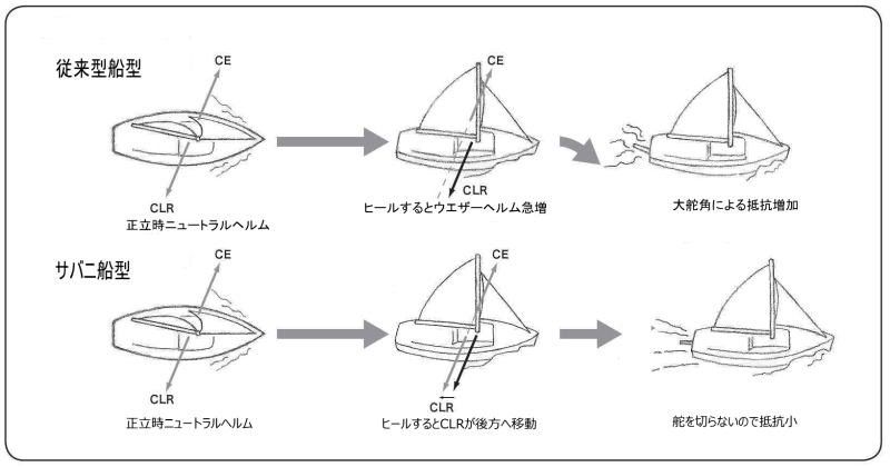 他のヨットでは得ることが出来ないこの特性は、CECLRのバランスが、ヒール状態においても保持されることによって、生み出されるのです。ヒール時にはCLRが後退することで、CECLRのバランスを保ちます。図解下側が、バランスを保っている状態です。