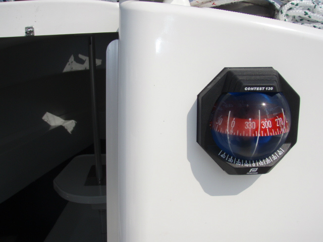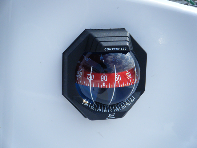コースを定めて操船するときに、コンパスを見ながら操船することは出来ません。ステアリングコンパスは、前方の操船目標を設定するために使用します。目標を定めた後はコンパスを見て操船するのではなく、遠くの目標を見ながらヘルムを取ります。PLASTIMOコンテスト130は、カードが大きくて目盛りが見やすく出来ています。夜間は航海灯と連動して内蔵照明が点灯します。