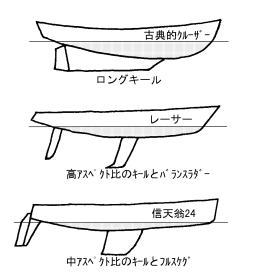 高アスペクト比のキール、ラダーは抵抗が少なく、スピードに優れます。しかし乱暴な操船をすると失速しやすいので、疲労をいとわないレーサーの乗り方に向いているのです。