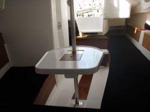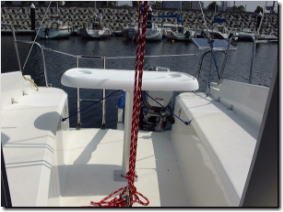 サバニ船型は後部の予備浮力が十分あるため、トランサムを開放できました。クルージング時には洗い物や、水遊びに実に使いやすくなりました。広いコクピットはセイリング中も港へ着いてからも、ゆったりと楽しめます。コクピットテーブルの設置も可能です。