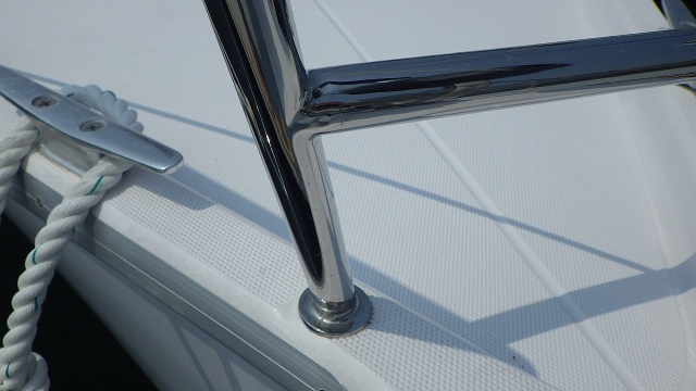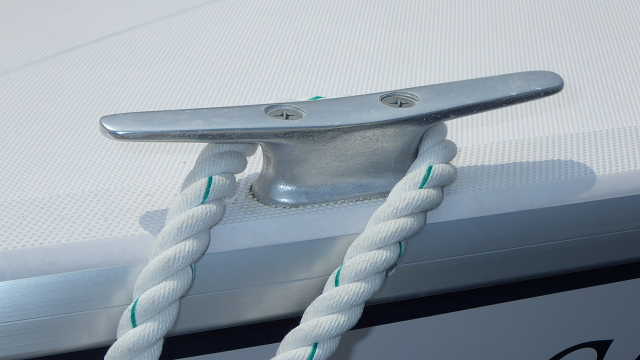 大型の200mmアルミクリートを、デッキとハルを貫通させて、取り付けボルトは緩まないようにロックつきナットで固定。バウ2ヶ所、スターン2ヶ所に設置。