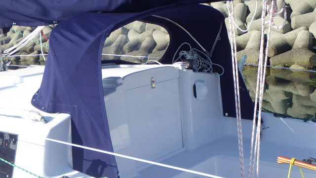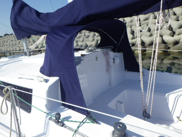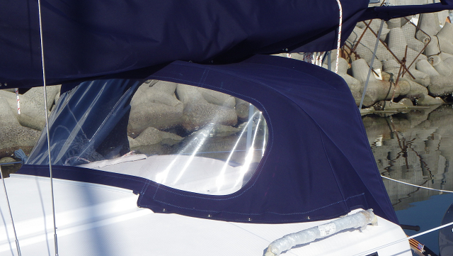 ドジャーは荒天時のセーリングの時に、コクピットへ打ち込んでくる波しぶきを防ぎます。雨の日でもスライドハッチ開放することが出来るので、キャビンの中が濡れにくいです。フレームとジョイントは頑丈なステンレス製。台風襲来時には取り外せます。ハードドジャーよりも実用的で安全です。