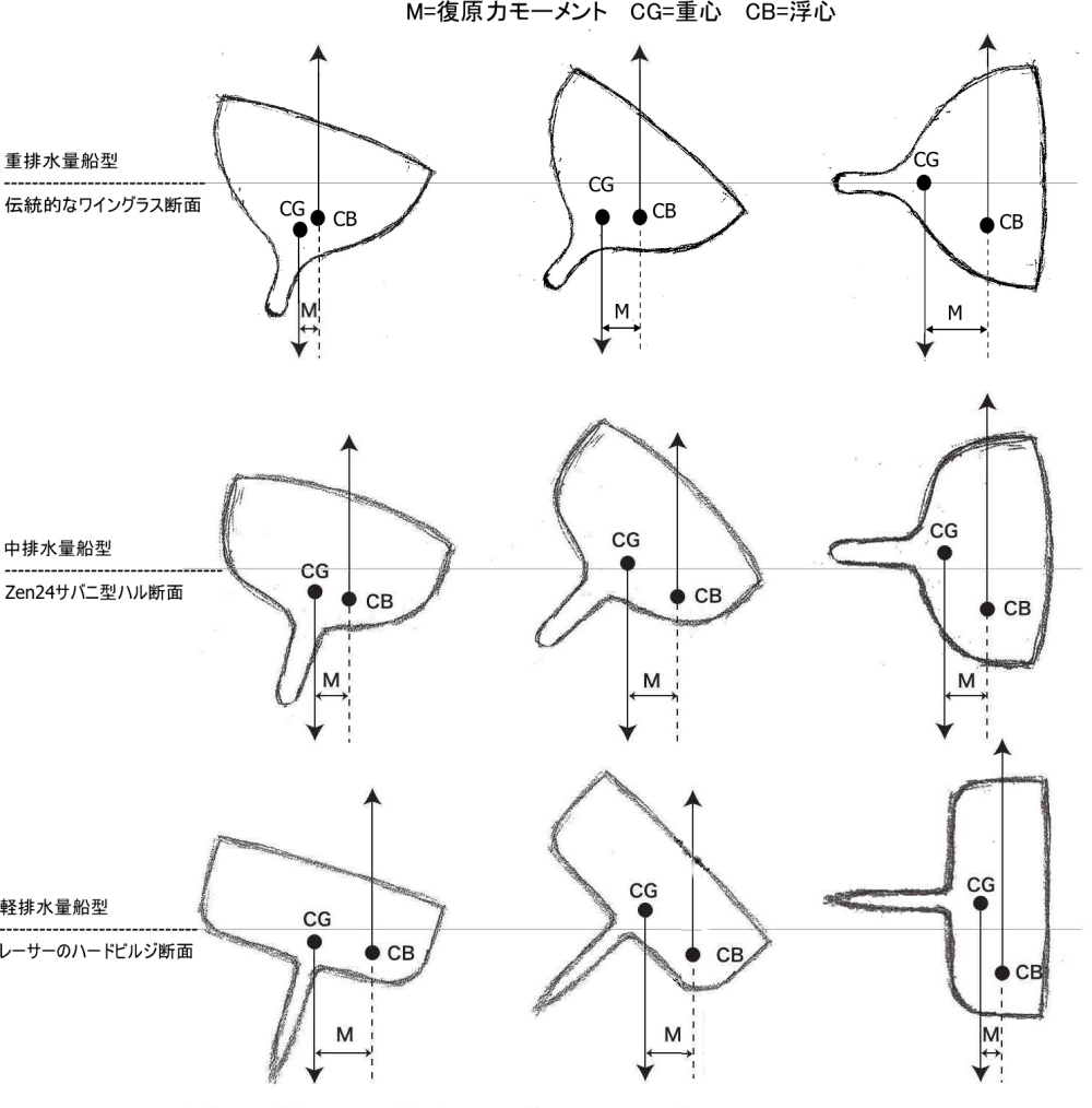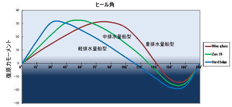ハル断面形状最大復原力出現角度展開セールエリア潜在スピードローリング周期乗り心地
